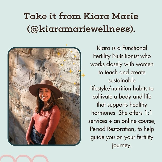 That is why I invited my friend Kiara, who specializes in fertility, to chat about it! Kiara (@kiaramariewellness) is a Functional Fertility Nutritionist who works closely with women to teach and create sustainable lifestyle + nutrition habits to cultivate a body and life that supports healthy hormones. She has attended the Nutritional Therapy Association, Institute of Functional Nutrition, and the Root Cause Protocol Institute. Kiara offers 1:1 services + an online course, Period Restoration, to help guide you on your fertility journey.